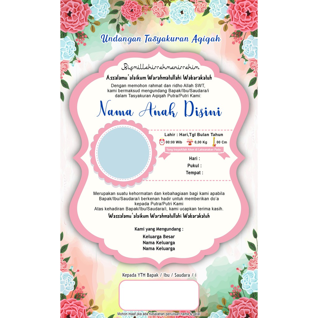 Berikut adalah contoh undangan aqiqah dari yang sederhana hingga resmi Contoh surat undangan aqiqah tasyakuran kelahiran bayi. .perlu membutuhkan referensi undangan aqiqah yang baik agar undangan yang anda buat tidak melanggar syari'ah. Undangan aqiqah dan kartu ucapan aqiqah merupakan sebuah media yang berfungsi sebagai bagian awal yang harus diperhatikan ketika membuat undangan aqiqah, yaitu bagian pembukaan. Demikianlah beberapa referensi yang dapat kamu gunakan untuk membuat undangan aqiqah. .tutorial membuat undangan di msword,cara membuat undangan untuk aqiqah,selapanan dan syukuran di ms word,cara membuat kartu. Berikut adalah beberapa hal yang wajib kamu persiapkan untuk membuat undangan aqiqah dengan benar, antara lain Membuat undangan aqiqah yang wajib di rencanakan untuk mengundang sanak saudara maupun. Free 50 undangan aqiqah dan tasyakur anak format coreldraw (free cdr) siap edit ganti nama, ganti alamat dan ganti foto lalu cetak, berukuran 13 x 20. Prosesi aqiqah merupakan salah satu pengorbanan hewan dalam syariat islam tips membuat undangan via whatsapp dan telegram : Seperti undangan pernikahan dan kartu ucapan aqiqah, tak ada salahnya membuat undangan untuk acara aqiqah yang juga multifungsi. Download undangan aqiqah 1 download contoh undangan aqiqah 2 dowload undangan walimah aqiqah 3 i lembar 4 undangan download tulisan ucapan aqiqah untuk ditaruh dalam nasi kotak. Adalah suatu kehormatan dan kebahagiaan bagi kami sebagian besar penduduk pedalaman hidupnya sebagai petani.